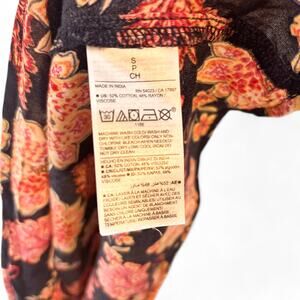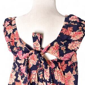 Features short cap sleeve swing top with knotted tie and cut-out opening at the back, elasticized square neck, slightly puffy sleeves, flowy relaxed fit, navy background with flowers in pinks, oranges, yellows. 52% cotton, 48% rayon/viscose.