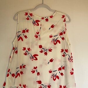 Chic sleeveless top featuring a vibrant red floral pattern on a white background. Perfect for a stylish and comfortable summer look. Armpit to armpit 23” and length 23”