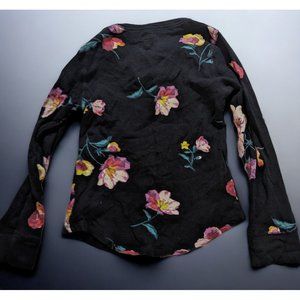 Casual and comfy floral thermal by Old Navy. It's in a textured black thermal fabric. It has a paint-look floral print in tones of pinks, reds, and whites. It has long sleeves, and a round neck. Perfect for layering on cold days!