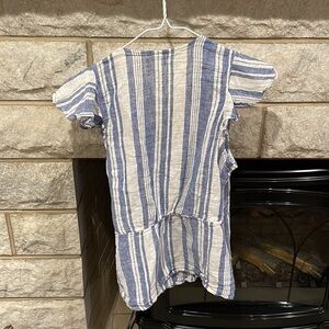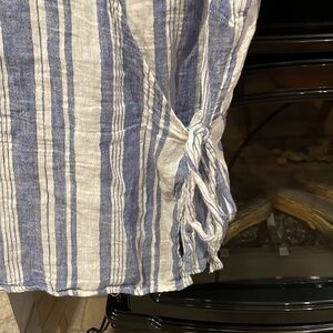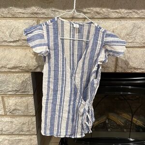 VGUC Flutter sleeve top with side tie. Blue and white linen blend. All the rage!