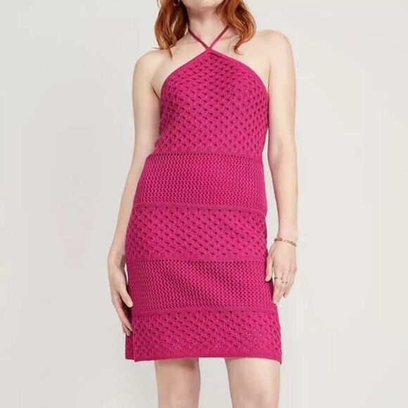 Old Navy Fushia Pink Halter Tie Strap Crochet Mini Dress size Xs vacation casual