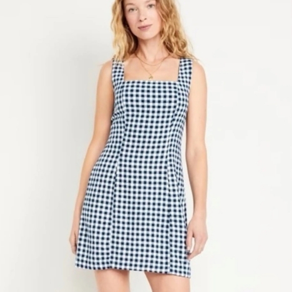 Chic blue and white gingham dress with a square neckline. Perfect for casual outings. Very good condition, Women's size Medium. Approximate flat lay measurements pit to pit 17 inches, Waist 14.5 inches, Length 33.5 inches.