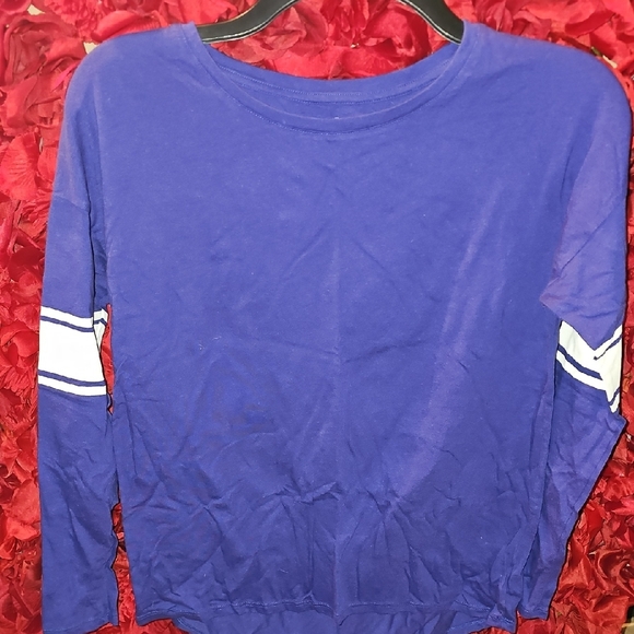 Stylish blue long sleeve top featuring white stripes on the sleeves. Perfect for casual wear.