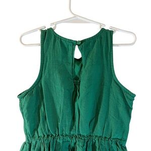 This is a charming girls' dress from Old Navy in a size small (6-7). The sleeveless dress features a solid green color, a round neckline, and flowy A-line silhouette, perfect for summer and spring occasions like parties or casual outings. Made of 100% cotton with embroidered accents, this pullover dress is machine washable for easy care. It exudes a cute and stylish look with its collarless design, making it a lovely choice for young girls looking for a comfortable and fashionable outfit.