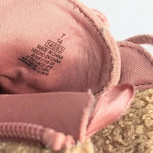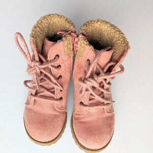 Old Navy girls size 7, faux suede hiking boots in color antique coral (color is more of a deep rosey pink than a salmon pink) with faux Sherpa trim on ankle, lace-up front and inside zipper for easy on/off. Gently Loved. Excellent Condition! There is a small scuff mark on the outside sole and light crease wear at the ankle and toes (see pics).