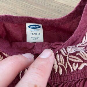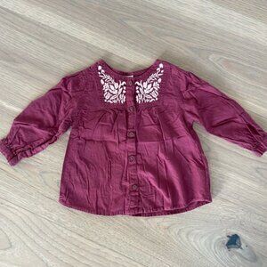 Old Navy Girls Maroon Embroidered Three Quarter Sleeved Peasant Shirt Sz 12-18M