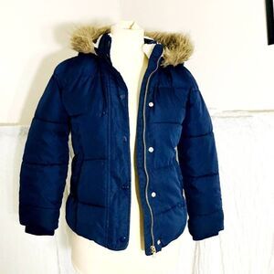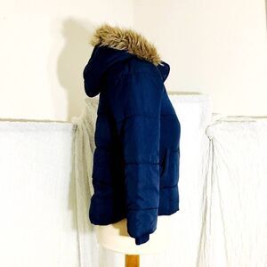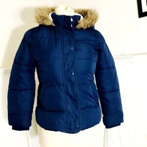 Navy Blue puffer hooded jacket with fawx fur around the fron of the hood. Front zipper and button closure. **Left pocket has a rip inside of it as pictured, other than that it's in good condition. Pre-owned. Please refer to pictures for best description and condition verification.