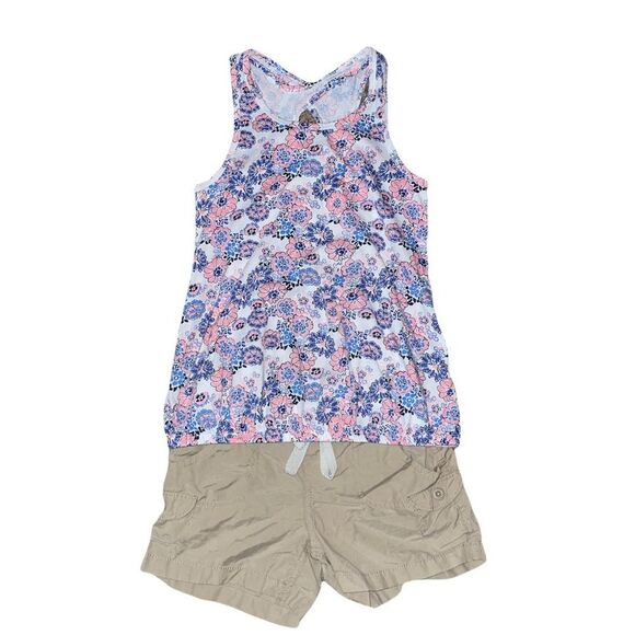 Old Navy Girls Outfit. Size Medium (8). Floral racer-back top with elastic around waist. Khaki shorts with elastic waist. No back pockets on shorts. Excellent used condition.