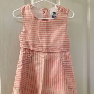 Old Navy Girls Pink Striped Open Back Dress Pockets Cotton Girls Size 2T. New With Tags. Such a cute dress, loved this, but my daughter refused to wear. Pink striped with front pockets, fully lined, three buttons on the back and an open lower back. Made to look like it is almost two pieces, but is only one piece. Has a linen feel to it, but is 100% Cotton.