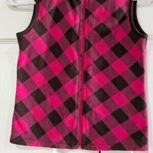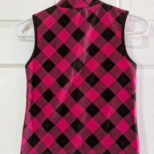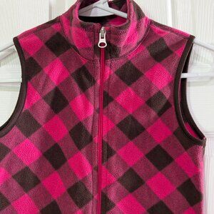 Old Navy girls' pink and brown buffalo plaid fleece vest, size M (8), from 2010. Made from soft 100% polyester with a full front zipper and cozy feel, perfect for layering in cooler weather. Machine washable. Pre-owned. Measures approximately 14" armpit to armpit and 17.5" from center back of neck to hem.