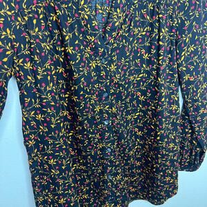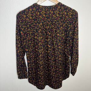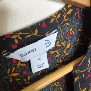 Old Navy Gold Red Floral Pattern Tunic Shirt Medium. Preowned and in excellent condition. Top has black background with gold leaves and red flowers. Tunic peasant like top. Please see all photos. Approx measurements in pictures.