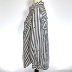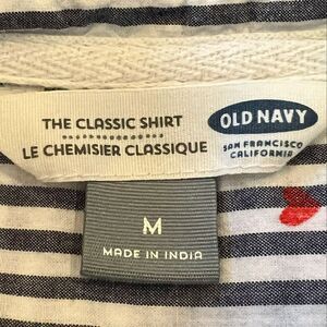 This Old Navy button-up shirt with gray stripes and red hearts is perfect for a chic yet casual look. Made from 100% cotton, it features a classic collar and button closure.