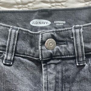 These Old Navy jean shorts in a classic gray hue feature a distressed design with frayed hems for a laid-back vibe. Crafted from durable denim, they offer a comfortable fit and a stylish, worn-in look. Perfect for casual outings, these shorts are a versatile addition to any wardrobe.