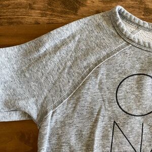 Old Navy sweatshirt, women's large, cotton blend (care tag missing). Medium heather gray, raglan sleeve with raw edge seams, side slit at hem, black logo graphic on chest.