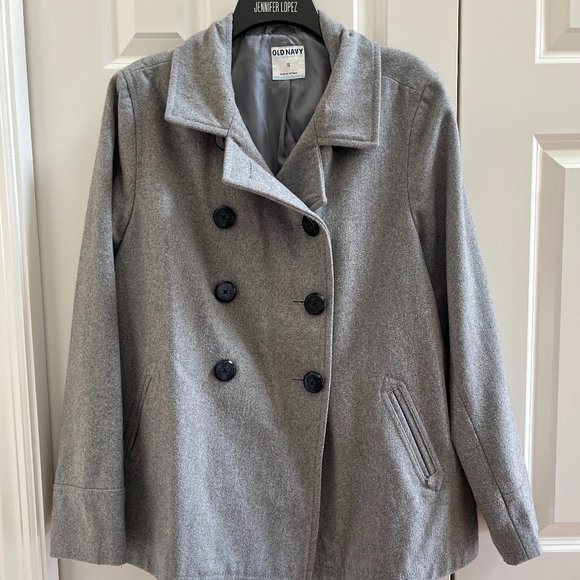 Stylish gray pea coat. Double-breasted design. Classic and versatile.