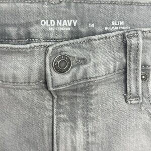 Classic gray distressed denim jeans by Old Navy in a boys size 14 slim fit. Features light distressing at the knees, adjustable waistband with pull tabs, and a comfortable stretch. Great everyday jeans for school, play, or casual wear.