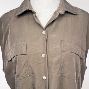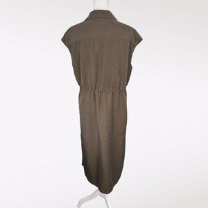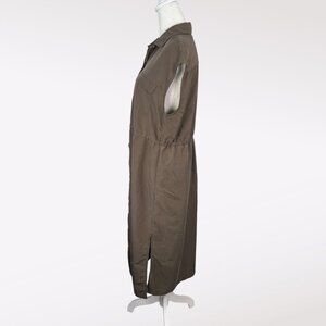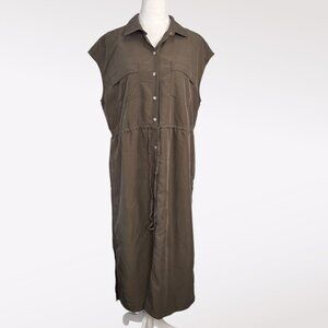 Button-down utility shirt dress in muted olive green with drawstring waist and chest pockets. Soft rayon blend with easy drape.