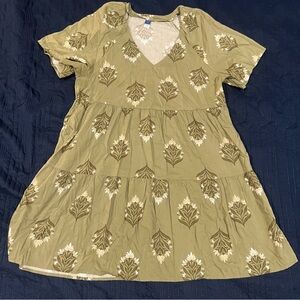 Old Navy dress, floral print dress, tiered dress, olive green dress, V-neck short sleeve dress, casual summer dress, cotton rayon blend, boho style dress, women’s size large