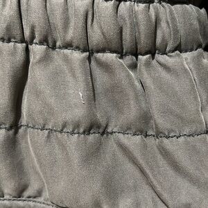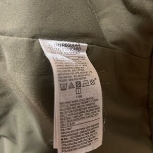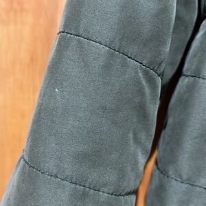 This green jacket from Old Navy is a girl's size extra large, equivalent to a size 14. It features a zipper and button closure, with sherpa fleece lining the hood. There are visible button holes around the hood where a faux fur lining was previously attached but is now missing. This jacket has two small white spots and two small pulls. Otherwise, it is in good used condition.