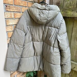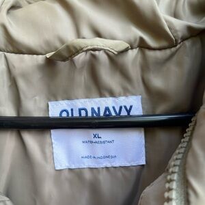 Stay warm and stylish with this green puffer jacket from Old Navy, featuring a cozy hood and quilted sections for enhanced insulation. Its mid-length cut and fitted waist provide a flattering silhouette, perfect for braving the cold in style.
