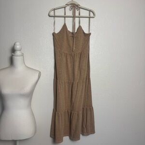 Chic tan maxi dress with tiered design. Halter tie neck. Open back. Perfect for casual outings. Size small. Cotton blend. Measurements laying flat are approximately Chest- 22 Length-24 (from chest)
