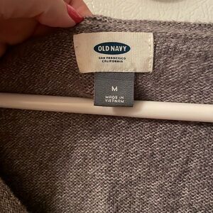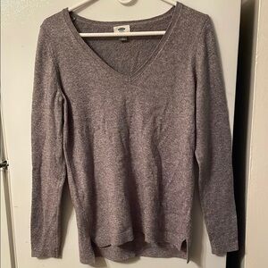 Soft heather gray knit sweater. Features a classic V-neck design. Ideal for casual wear.