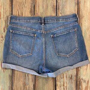 Old Navy High Approx 10.5” Rise Cuffed Denim Shorts, Size 12, Stretch, Distressed . Preowned. Distressing at the right hip. Good condition. Whiskered. Waist measures approx 33”. Fading and whiskering create a distressed, lived-in look!