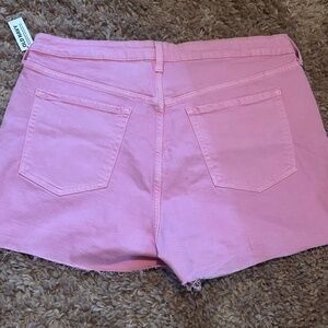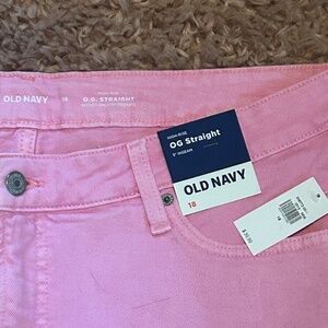 Old Navy OG Straight 3 inch cutoff shorts. Size 18. These high-rise shorts have Secret-Smooth pockets. In a washed out pink denim, they are a classic 5 pocket style and have frayed cut-off leg openings. Made of 99% cotton and 1% spandex.