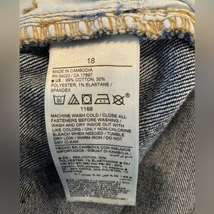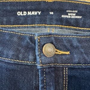This is a pair of Old Navy High Rise Wow Super Skinny Jeans in size 18. They are dark blue in color and made of polyester, spandex, and cotton denim fabric. The jeans feature a zip and button closure, have a high rise fit, and a 28-inch inseam. They are designed with comfort and stretch, have pockets, and are suitable for winter, summer, fall, and spring wear.