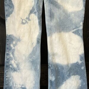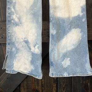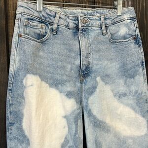 Old Navy brand Higher High-Rise Flare Jean. Size 8. Super High waist / high waisted style. Flared. Split hems. Factory bleach spots. Light denim. Secret smooth pocket. Stretch material. Preloved. Please see all photos for condition. Small spots (pictured) that may or may not wash out.