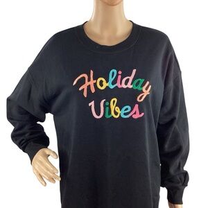 • “Holiday Vibes” multicolor embroidered front graphic