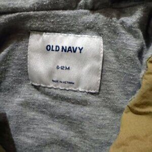 Great condition Old Navy hooded jacket in size 6 to 12 months. Gender neutral tan color with front pockets and a full zip closure. Soft interior lining makes it perfect for fall or spring weather. No stains, tears, or visible wear. Comes from a clean, smoke free home.