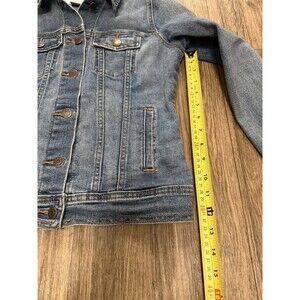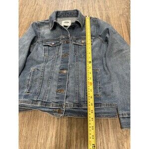 The product is a vintage Old Navy denim jacket in women's size small, featuring a solid blue color with a mid-length and long sleeve design. Made of cotton denim, this regular fit jacket is machine washable and has a button closure. Perfect for a basic jacket style with a touch of Y2K fashion, this jacket is a versatile addition to any wardrobe. Good Used Condition- See photos 122