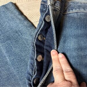 Old Navy Jeans Button-Fly High-Waisted O.G. Straight Cut-Off Size 26 NWT! Medium wash. Waist is 23.5 inches. Inseam is about 28 inches. Snug from hip to thigh. There is on small flaw on ride side of jeans, show in pic. Slim straight leg that tapers at ankle. Sits right at your belly button. 5 pockets on these jeans. Button up in front. 94% cotton, 5% recycled cotton, 1% spandex. Machine washable.