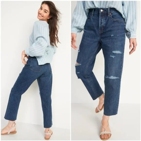 Old Navy Jeans Womens 14 High Rise Slouchy Straight Button Fly Fray Raw Hem Distressed Denim Blue. New with tags. Center front button closure. Front/back pockets.