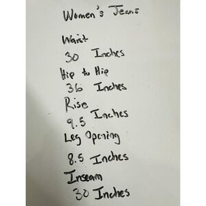 Measurements from handwritten board in photos: Waist 30 inches; Hip to Hip 36 inches; Rise 9.5 inches; Leg Opening 8.5 inches; Inseam 30 inches