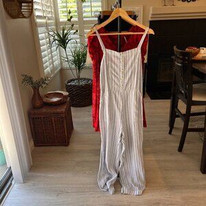 Old Navy Jumpsuit Womens SZ Small Blue & White Linen Blend Pockets Buttons Beach