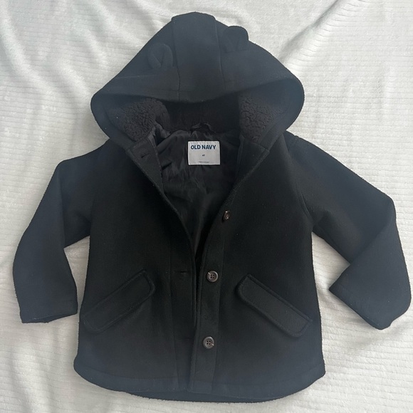 Chic black pea coat with cozy hood. Perfect for cool days. Soft and stylish.