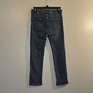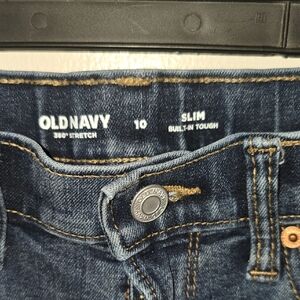 Stylish dark blue jeans for kids. Features distressed details. Comfortable and trendy.
