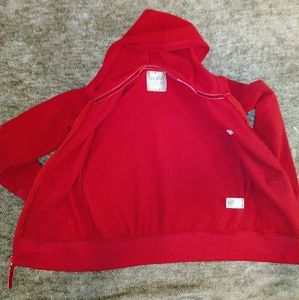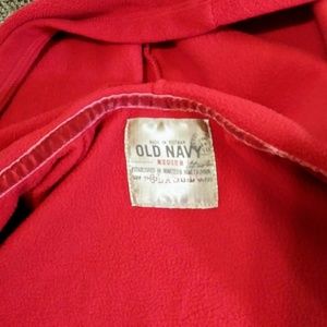Old Navy Kids hooded fleece jacket red,size med.Zip up,2 pockets(edges threaded with gold thread).