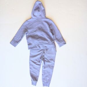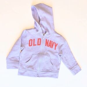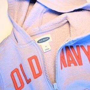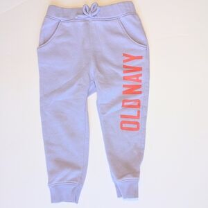 Comfortable and stylish, this size 2T Old Navy kids tracksuit features a Light Purple hoodie and joggers with bold red "OLD NAVY" signature lettering on front of hoodie and side of left leg. Perfect for active days. 52% Cotton/48% Polyester. Gently Loved. Good Condition.