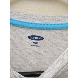 Old Navy Kids Medium(8) Gray T-Shirt, has a front pocket on the left side of the shirt. The graphic is a skeleton fishing on a deserted island with a doughnut trying to catch sharks.