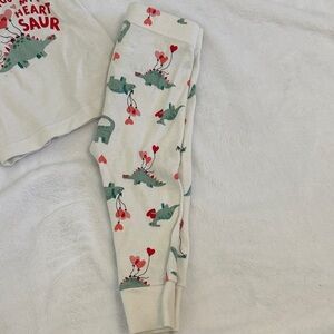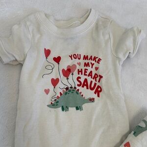 Charming pajama set with a fun dinosaur design. Soft fabric ensures comfort. Includes a white top and matching pants with red and green accents. Perfect for Valentine’s Day.