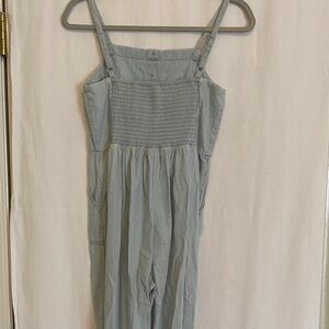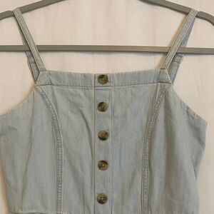 Stylish light blue denim jumpsuit. Features button front and adjustable straps. Perfect for casual outings.