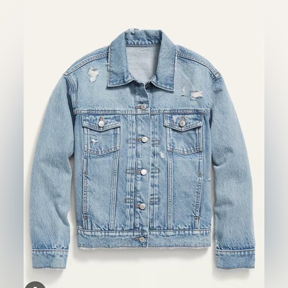 Classic denim jacket. Light blue wash. Distressed details. Button front closure. Two chest pockets. Size XXL TALL. Oversized fit.