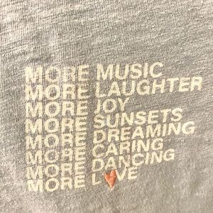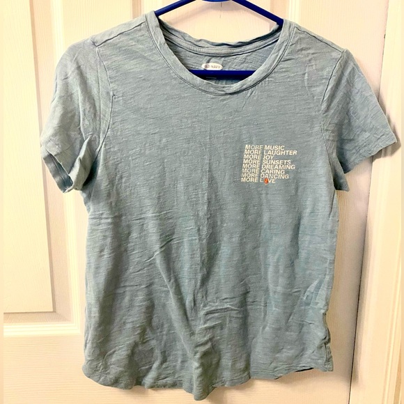 Light blue T-shirt from Old Navy featuring white lettering that says MORE MUSIC MORE LAUGHTER MORE JOY MORE SUNSETS MORE DREAMING MORE CARING MORE DANCING MORE LOVE.
