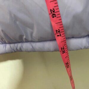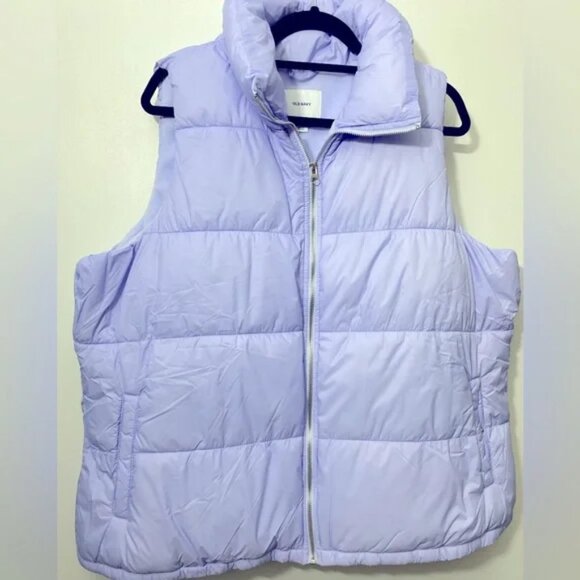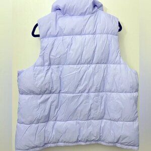 Light purple puffer vest. Sleeveless design. Front zipper closure. High collar for warmth.