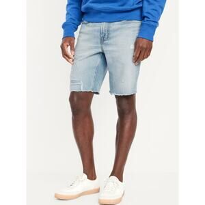 The Old Navy Light Wash Destructed Slim Fit Jean Shorts for Men, Size 38, feature a high-rise design with a distressed finish. These shorts offer a trendy, relaxed fit with a cut-off hem, perfect for a casual and stylish summer look.