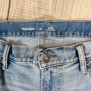 Old Navy, Blue, Destructed, Light Wash, Slim Fit, Built in Flex, Jean Shorts, Men’s, Size 38, High Rise, Distressed, stylish, casual, comfortable, trendy, modern, versatile, high-quality, relaxed, jean shorts, denim shorts, Bermuda shorts, cut off shorts
