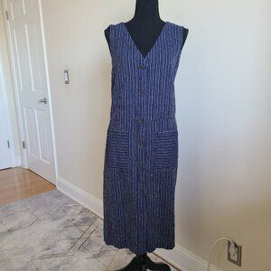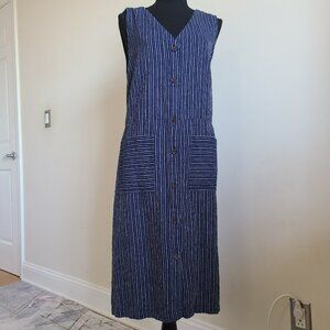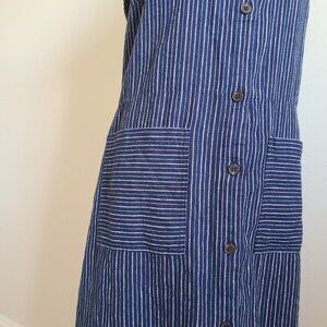 Classic Old Navy sleeveless midi dress in navy and white stripes. Features a button-front design, deep front patch pockets, and a relaxed fit. Lightweight linen blend fabric makes it breathable and perfect for warm weather or layering.